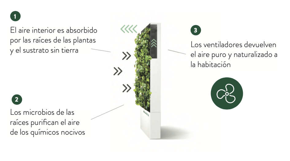 Además, este panel fonoabsorbente actúa como purificador de aire gracias a su ciclo constante de absorción y liberación de la humedad ambiental, que propicia la renovación de las partículas de aire.