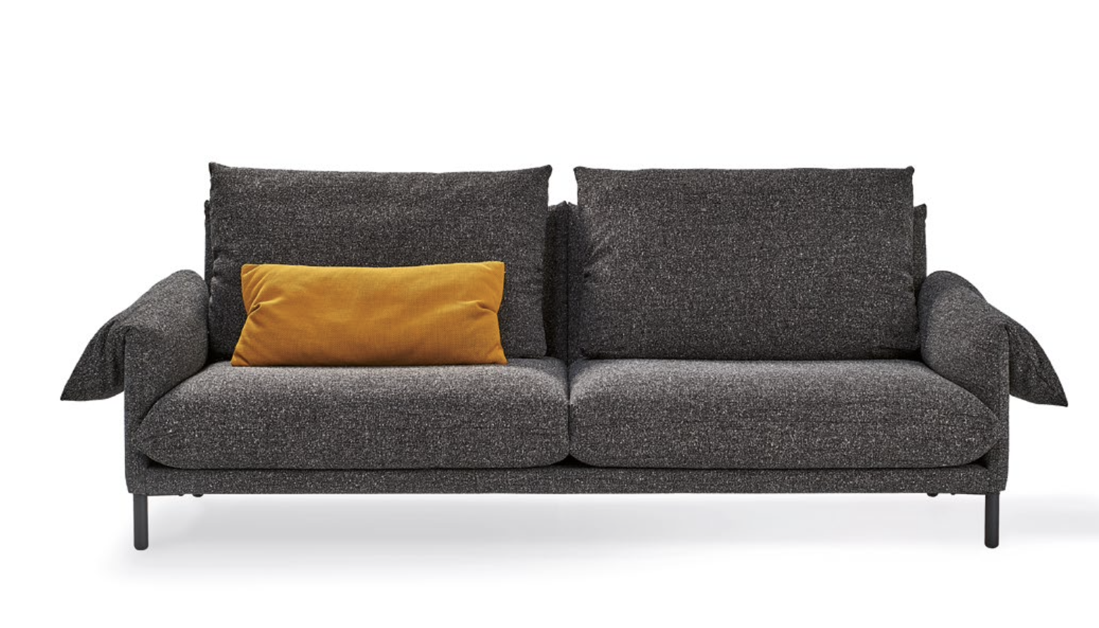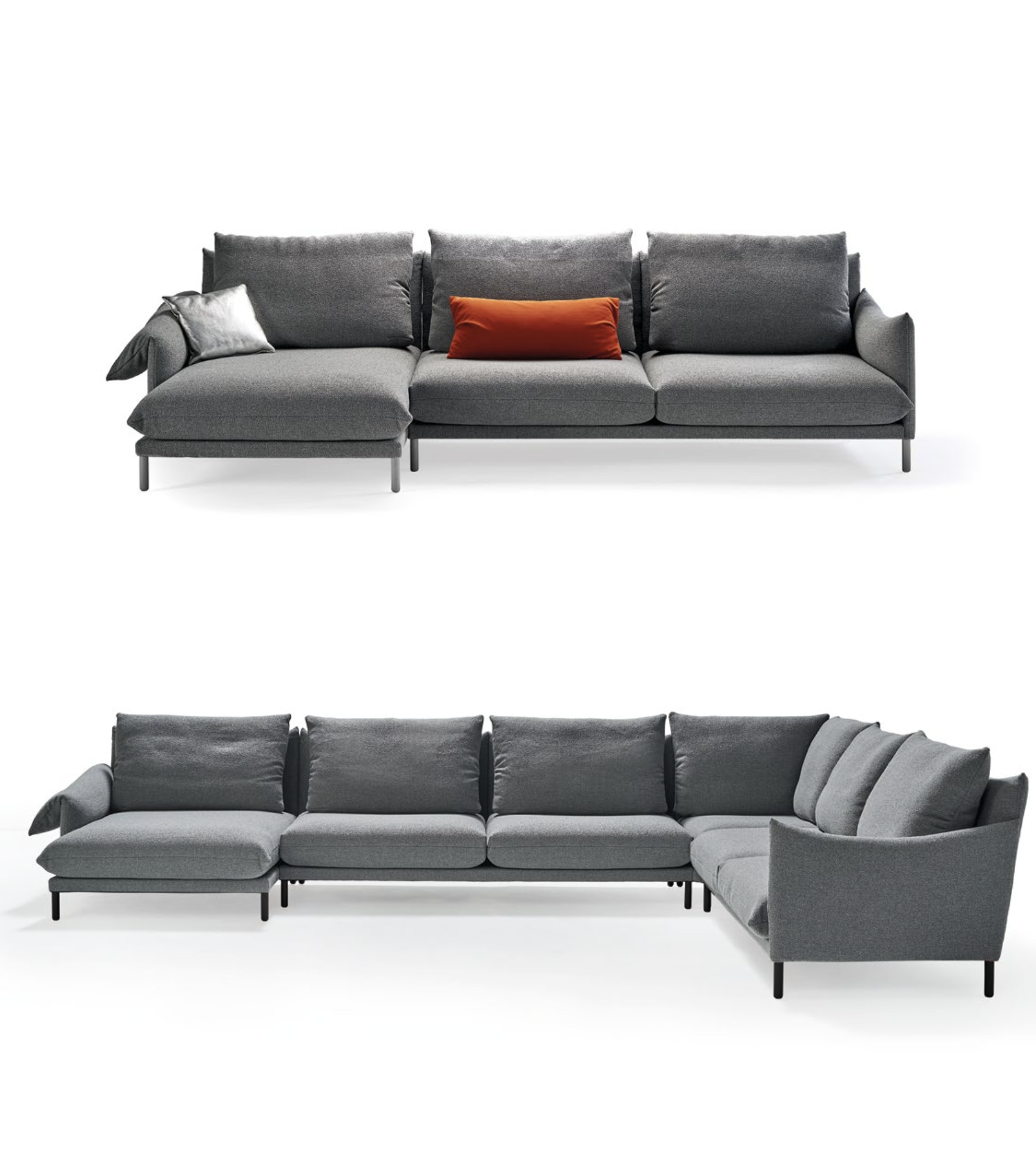 Rafa ha diseñado múltiples soluciones para personalizar las composiciones. Un brazo solapa que imita una manta dejada caer sobre sí mismo y un brazo recto. Cuatro tipos de puf con diferentes funciones: integrado dentro de la composición como un asiento