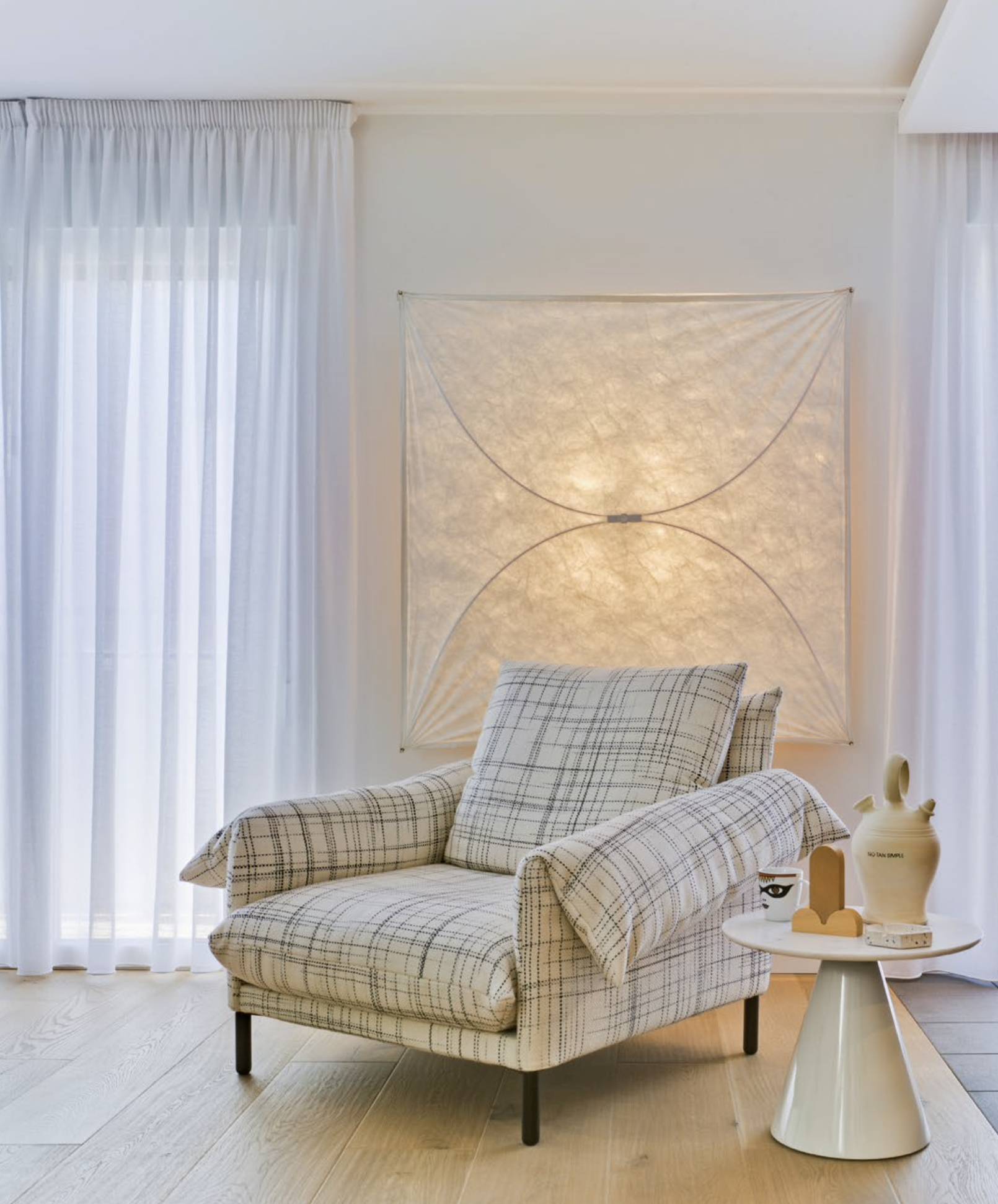 Especialmente concebido para uso doméstico, el diseñador crea un reconfortante refugio para la intimidad del hogar. La altura del respaldo es uno de los elementos a destacar, pues recoge de manera natural la cabeza.