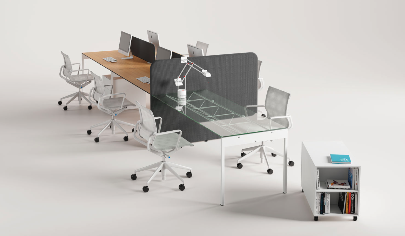 Iris es versatilidad, operatividad y funcionalidad. El diseño innovador y moderno de todos sus elementos permite múltiples combinaciones creando espacios agradables para trabajar en equipo y para el trabajo individual. Encimeras, mamparas, pedestales móviles y mamparas valla en diferentes colores y materiales aportan singularidad y personalidad a las oficinas.