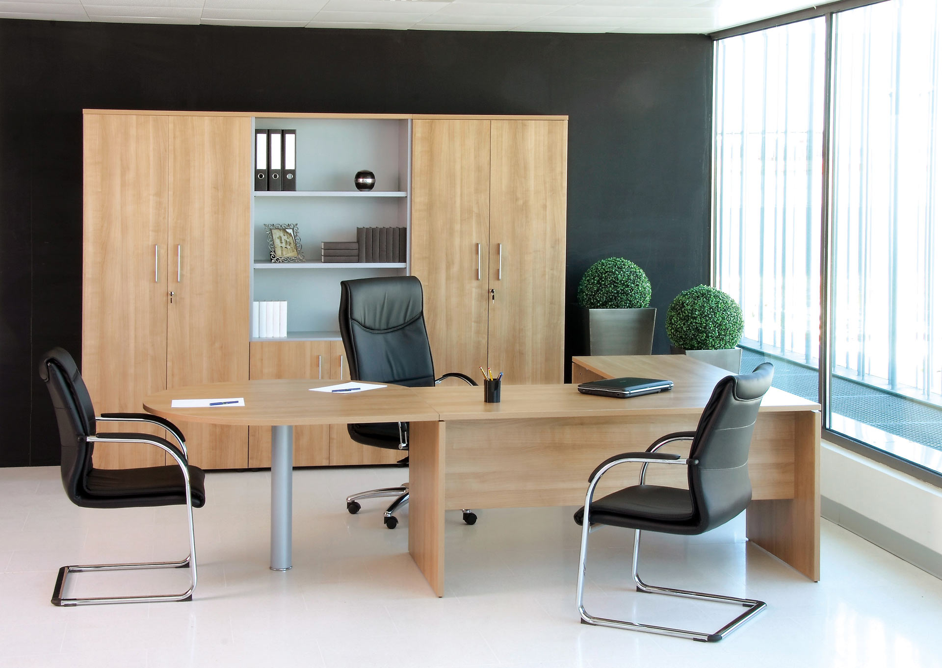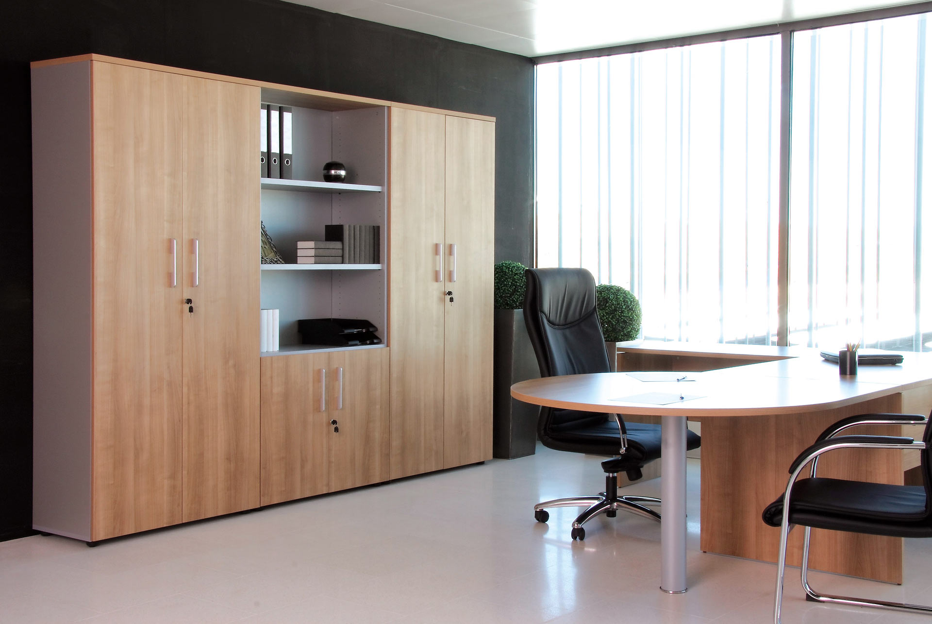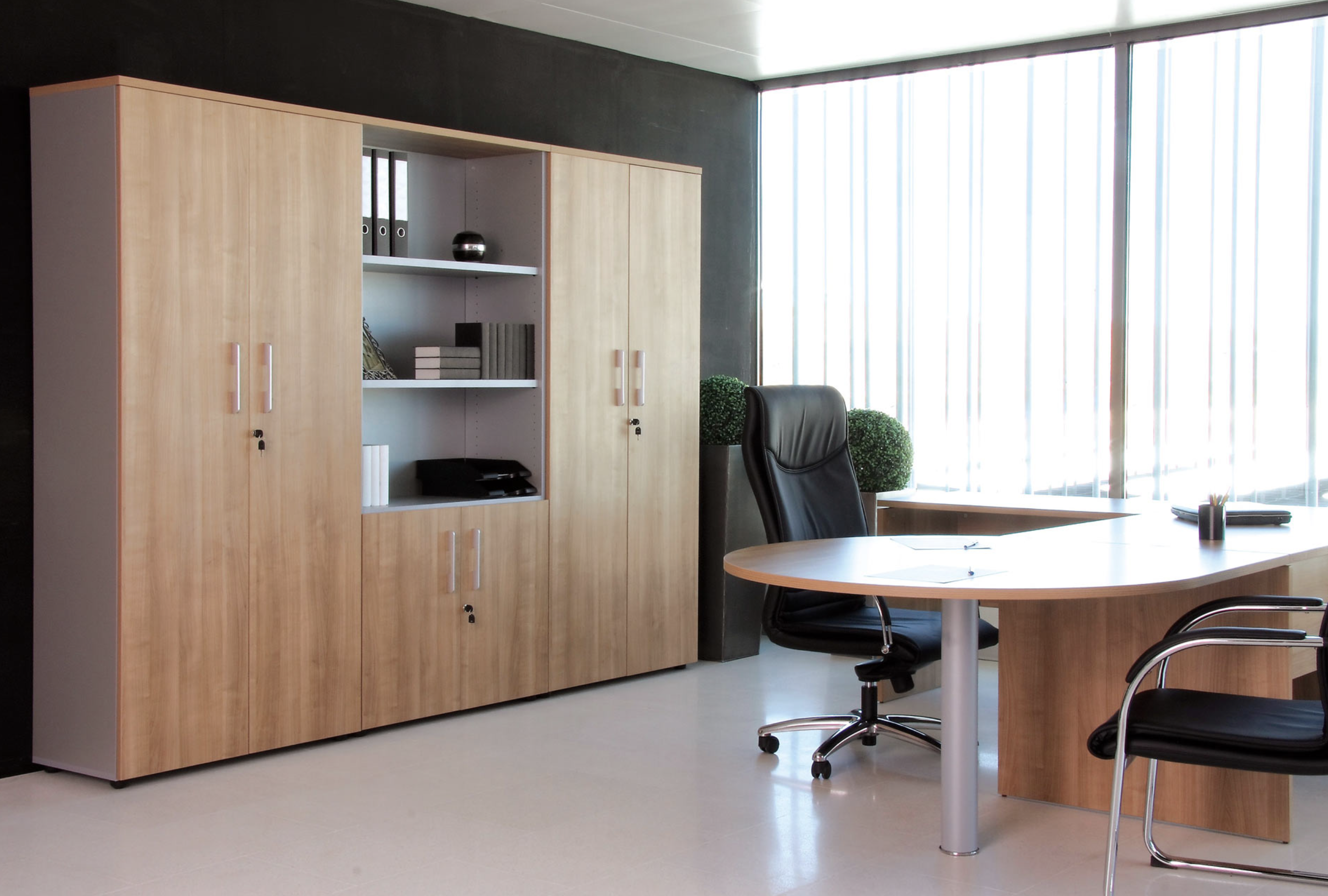 Con su estructura de melanina y su faldón incorporado, la mesa de oficina BÁSICA aporta una sensación de simplicidad y continuidad. Permitiendo personalizar su despacho aportando una imagen de elegancia y distinción.