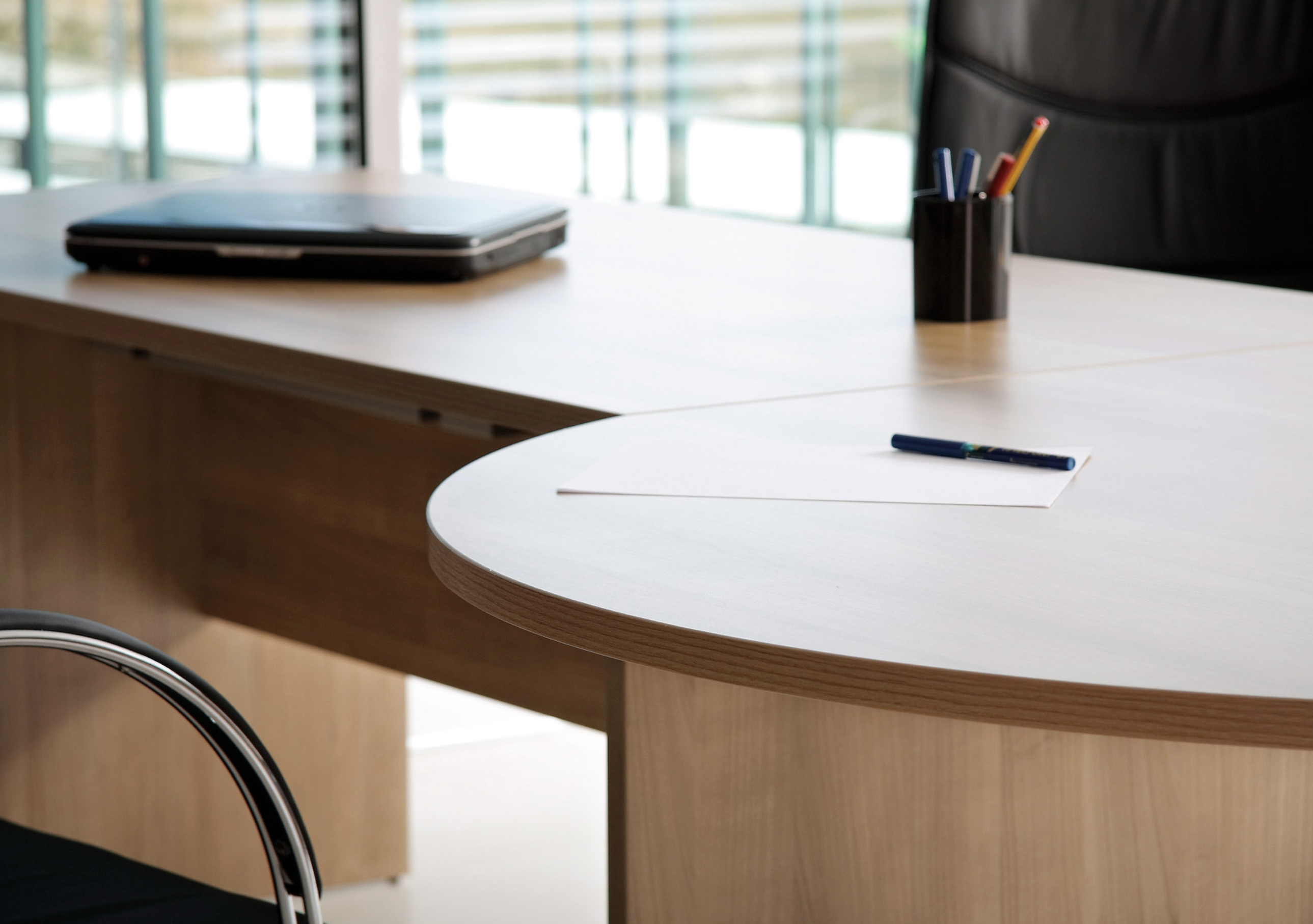 Las mesa de oficina BÁSICA, proporcionan una rigidez sorprendente debido a que su unión entre patas es posible gracias a un faldón del mismo material con la doble función de unión rígida entre patas