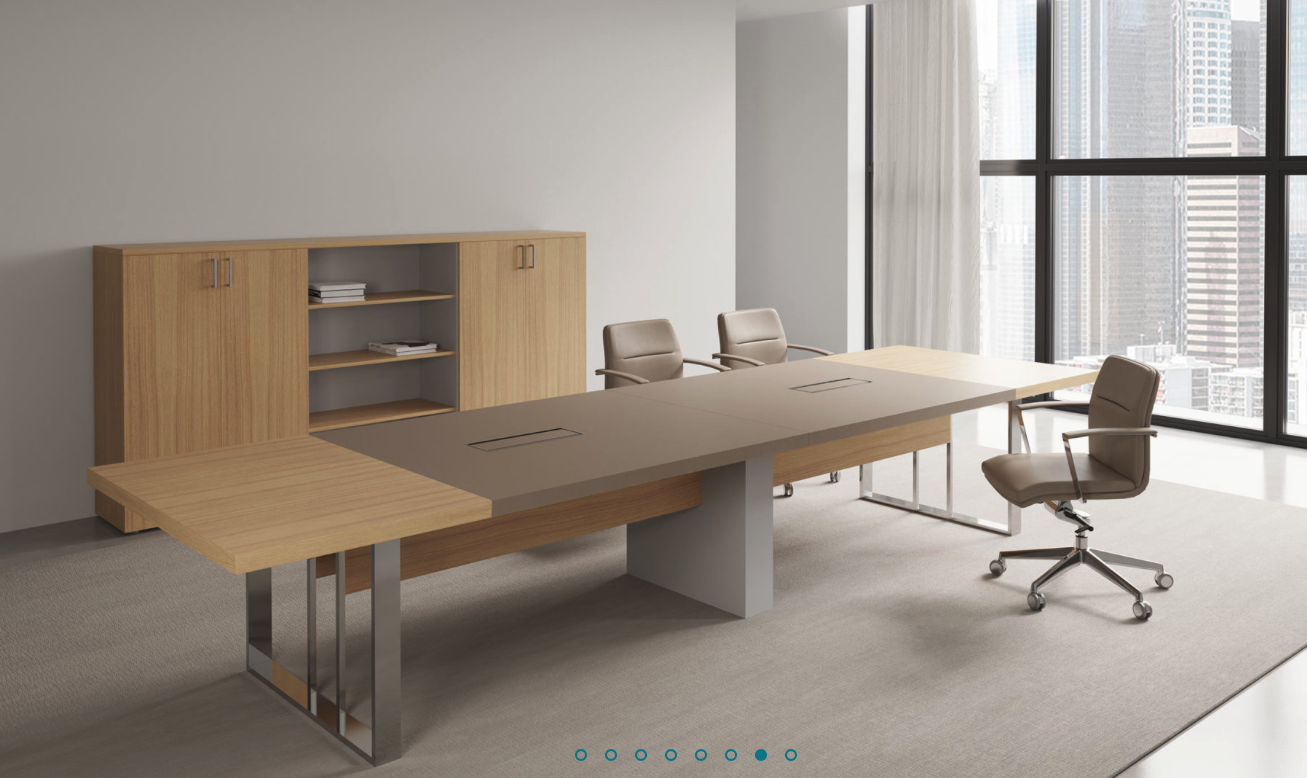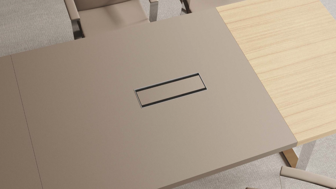 El nuevo modelo Plus de Supra completa la colección en este nivel con mesas de juntas que se convierten en piezas exclusivas por la virtud de poder diseñar el ancho tablero en combinaciones de madera natural con madera lacada o pieles de alta calidad.